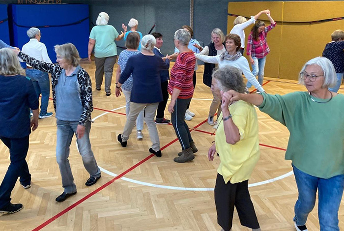 Das Besondere an dieser Gruppe: Kurze Folgen, die auf kleiner Fläche getanzt werden können, viel Zeit zum Tanzen, ausführliche Wiederholungen sowie individuelle Hilfestellung.